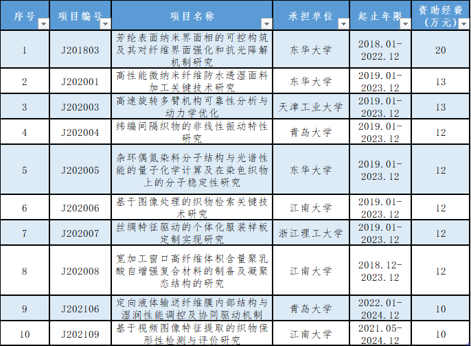 为提高行业创新能力,夯实行业科技发展基础,推进纺织行业科技进步,纺织之光科技教育基金会(以下简称“纺织之光基金会”)自2011年起,支持在全行业开展应用基础研究工作,包括行业发展具有前瞻性和长远性意义的基础性研究,学科交叉、融合与渗透的纺织前沿技术基础性研究,为解决行业共性、关键技术的基础性研究。截至2024年末,纺织之光基金会共资助立项103项,资助研究经费1844万元。 2025年3月-7月,中国纺织工业联合会(以下简称“中国纺联”)陆续组织专家对东华大学承担的“芳纶表面纳米界面相的可控构筑及其对纤维界面强化和抗光降解机制研究”和“杂环偶氮染料分子结构与光谱性能的量子化学计算及在染色织物上的分子稳定性研究”,青岛大学承担的“纬编间隔织物的非线性振动特性研究”和“定向液体输送纤维膜内部结构与湿润性能调控及协同驱动机制”,江南大学承担的“基于图像处理的织物检索关键技术研究”“基于视频图像特征提取的织物保形性检测与评价研究”“宽加工窗口高纤维体积含量聚乳酸自增强复合材料的制备及凝聚态结构的研究”,天津工业大学承担的“高速旋转多臂机构可靠性分析与动力学优化”,浙江理工大学承担的“丝绸特征驱动的个体化服装样板定制实现研究”,东华大学承担的“高性能微纳米纤维防水透湿面料加工关键技术研究”共十项“纺织之光”中国纺织工业联合会应用基础研究项目分批进行结题验收。验收委员会听取了项目承担单位的汇报,审阅了相关资料,经质询和讨论,认为十个项目均完成了任务书规定的要求,同意通过结题验收。 东华大学“芳纶表面纳米界面相的可控构筑及其对纤维界面强化和抗光降解机制研究”等两项目 3月13日,中国纺联组织专家在上海市对东华大学承担的“纺织之光”应用基础研究项目“芳纶表面纳米界面相的可控构筑及其对纤维界面强化和抗光降解机制研究”和“杂环偶氮染料分子结构与光谱性能的量子化学计算及在染色织物上的分子稳定性研究”两个项目进行结题验收。验收委员会听取了项目承担单位的汇报,审阅了相关资料,经质询和讨论,认为两项目完成了任务书规定的要求,同意通过结题验收。 “芳纶表面纳米界面相的可控构筑及其对纤维界面强化和抗光降解机制研究”项目系统研究了芳纶表面构筑的ZnO纳米界面相对纤维表面化学组成及形貌、力学性能、抗紫外性能以及芳纶/环氧树脂复合材料界面粘结性能的影响规律。通过设计调控ZnO纳米界面相在芳纶表面的微观形貌以及ZnO纳米界面相与芳纶表面之间的相互作用力,采用硅偶联剂(KH550)将纳米ZnO以共价键方式接枝到纤维表面进行改性,显著提高了芳纶的抗紫外性能以及界面粘结性能。 项目实施期间,发表论文11篇,其中SCI收录6篇;申请国内发明专利4件;培养研究生5人。 “杂环偶氮染料分子结构与光谱性能的量子化学计算及在染色织物上的分子稳定性研究”项目设计合成了多种含D-π-A结构的噻唑杂环偶氮染料,研究了不同结构染料分子的染色性能,实现了水洗色牢度及日晒色牢度的提升。采用量子化学理论计算方法,分析了不同结构染料分子前沿轨道能量和组成、电荷分布以及分子间相互作用等结构参数,为开发具有D-π-A体系富电子杂环结构的偶氮染料提供了重要理论基础,对新型高性能染料的开发具有研究价值。 项目实施期间,发表论文10篇,其中SCI收录6篇;申请国内发明专利3件;培养研究生6人。 青岛大学“纬编间隔织物的非线性振动特性研究”等两项目 3月19日,中国纺联组织专家在山东省青岛市对青岛大学承担的“纺织之光”应用基础研究项目“纬编间隔织物的非线性振动特性研究”和“定向液体输送纤维膜内部结构与湿润性能调控及协同驱动机制”两个项目进行结题验收。验收委员会听取了项目承担单位的汇报,审阅了相关资料,经质询和讨论,认为两项目完成了任务书规定的要求,同意通过结题验收。 “纬编间隔织物的非线性振动特性研究”项目系统研究了纬编间隔织物的结构材料性与振动参数对隔振系统动力学响应的影响规律,构建了含偶次项多项式的非线性刚度模型及分数阶导数阻尼模型,阐明了非线性刚度和阻尼对振动传递率、共振频率及振频率区间的调控机制;通过分析间隔层屈曲单丝的微观变形,建立了基于约束弹性细杆理论的静态压缩力学模型,揭示了织物细观结构与宏观压缩力学非线性响的内在关联;开发了具有高静低动刚度特性的纬编间隔织物防振手套及汽车座椅减振材料,其减振性能优良,同时兼具质轻、透湿透气等优点,为特种防护装备、精密仪器运输包装等领域的减振需求提供了新材料。 项目实施期间,发表论文6篇,其中SCI收录2篇;申请发明专利1件;培养研究生 3人。 “定向液体输送纤维膜内部结构与湿润性能调控及协同驱动机制”项目创建了静电纺丝/静电喷涂制备具有多层孔径结构梯度及润湿梯度纳米纤维膜材料的方法,成功设计搭建了多针静电纺丝试验设备,利用静电纺丝技术制备不同润湿性纳米纤维膜,通过静电涂调控纤维膜润湿性能,使其在厚度方向同时具有对油和水的润湿梯度特性。通过对纤维膜结构和润湿性调整优化,实现了水和油自发反向输送,在可控油水及其乳液分离方面具有应用前景。 项目实施过程中发表SCI论文12篇,其中1篇发