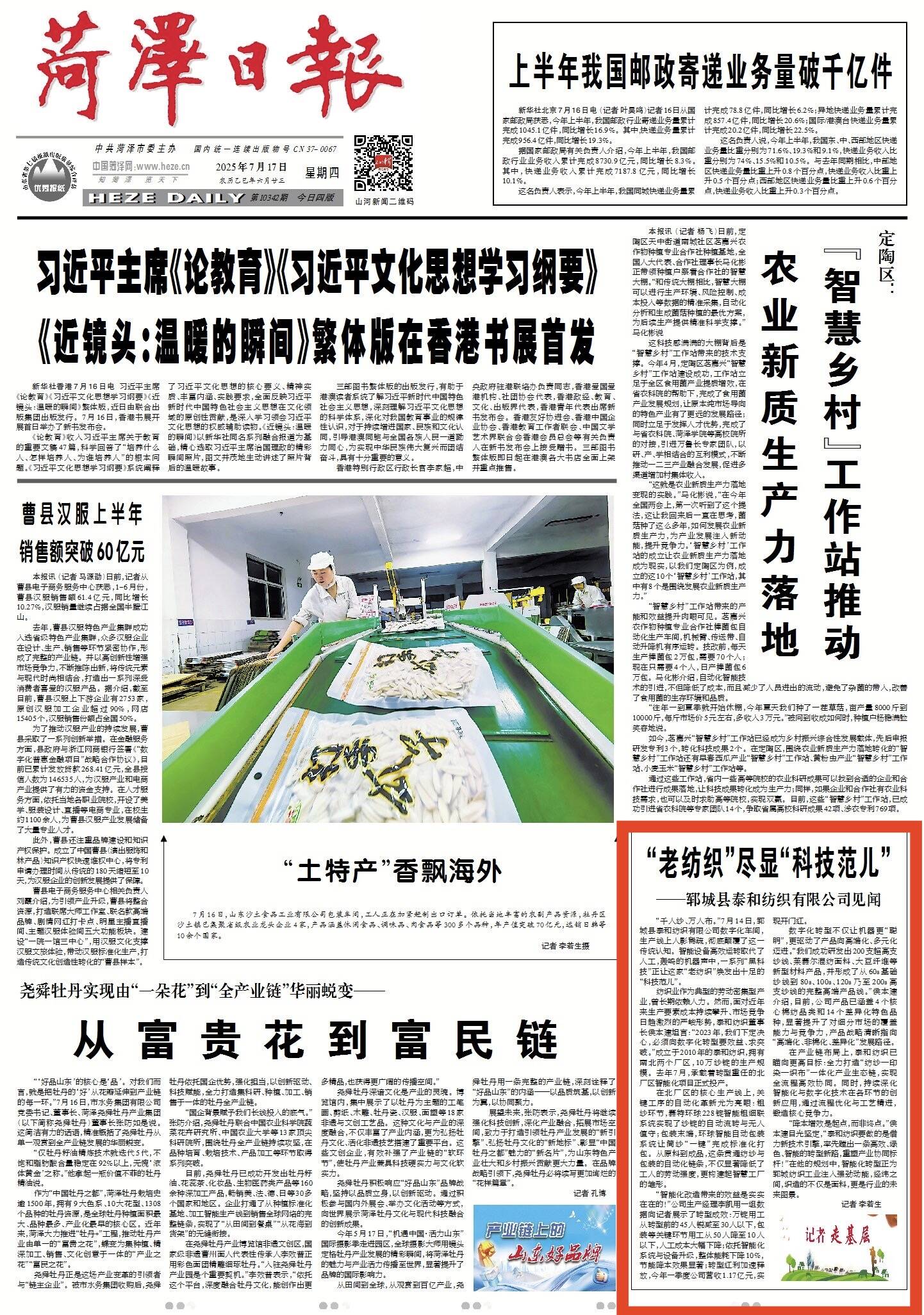 7月17日,菏泽日报头版刊发《“老纺织”尽显“科技范儿”——郓城县泰和纺织有限公司见闻》,以泰和纺织智能化转型为切入点,聚焦我县传统行业——纺织工业转型升级中的探索与突破。 【菏泽日报原文】 “千人纱、万人布。”7月14日,郓城县泰和纺织有限公司数字化车间,生产线上人影稀疏,彻底颠覆了这一传统认知。智能设备高效运转取代了人工,轰鸣的机器声中,一系列“黑科技”正让这家“老纺织”焕发出十足的“科技范儿”。 纺织业作为典型的劳动密集型产业,曾长期依赖人力。然而,面对近年来生产要素成本持续攀升、市场竞争日趋激烈的严峻形势,泰和纺织董事长侯本建坦言:“2023年,我们下定决心,必须向数字化转型要效益、求突破。”成立于2010年的泰和纺织,拥有南北两个厂区,10万纱锭的生产规模。去年7月,承载着转型重任的北厂区智能化项目正式投产。 在北厂区的核心生产线上,关键工序的自动化革新尤为亮眼:粗纱环节,赛特环球228锭智能粗细联系统实现了纱锭的自动流转与无人值守;包装末端,环球智能自动包装系统让筒纱“一键”完成标准化打包。从原料到成品,这条贯通纺纱与包装的自动化链条,不仅显著降低了工人的劳动强度,更构建起智慧工厂的雏形。 “智能化改造带来的效益是实实在在的!”公司生产经理李凯用一组数据向记者展示了转型成效:万锭用工从转型前的45人锐减至30人以下,包装等关键环节用工从50人降至10人以下,人工成本大幅下降;依托智能化系统与设备升级,整体能耗下降10%,节能降本效果显著;转型红利加速释放,今年一季度公司营收1.17亿元,实现开门红。 数字化转型不仅让机器更“聪明”,更驱动了产品向高端化、多元化迈进。“我们成功研发出200支超高支纱线、莱赛尔混纺面料、大豆纤维等新型材料产品,并形成了从60s基础纱线到80s、100s、120s乃至200s高支纱线的完整高端产品线。”侯本建介绍,目前,公司产品已涵盖4个核心棉纺品类和14个差异化特色品种,显著提升了对细分市场的覆盖能力与竞争力,产品战略清晰指向“高端化、非棉化、差异化”发展路径。 在产业链布局上,泰和纺织已瞄向更高目标:全力打造“纺纱—印染—织布”一体化产业生态链,实现全流程高效协同。同时,持续深化智能化与数字化技术在各环节的创新应用,通过流程优化与工艺精进,锻造核心竞争力。 “降本增效是起点,而非终点。”侯本建目光坚定,“泰和纺织要做的是借力新技术引擎,率先蹚出一条高效、绿色、智能的转型新路,重塑产业协同标杆!”在他的规划中,智能化转型正为郓城纺织工业注入强劲动能,经纬之间,织造的不仅是面料,更是行业的未来图景。